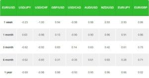 In the financial world, correlation is a statistical measure of how two securities move in relation to each other. Currency correlation, then, tells us whether two currency pairs move in the same, opposite, or totally random direction, over some period of time. When trading currencies, it’s important to remember that since currencies are traded in pairs, no single currency pair is ever totally isolated. (Did we confuse you with our “currencies” tongue-twister sentence there?). Unless you plan on trading just one pair at a time, you must understand how different currency pairs move in relation to each other. Correlation is computed into what is known as the correlation coefficient, which ranges between -1 and +1. A perfect positive correlation (a correlation coefficient of +1) implies that the two currency pairs will move in the same direction 100% of the time. A perfect negative correlation (a correlation coefficient of -1) means that the two currency pairs will move in the opposite direction 100% of the time. If the correlation is 0, the movements between two currency pairs are said to have ZERO or NO correlation, they are completely independent and random from each other. We have no idea how one pair will move in relation to the other.