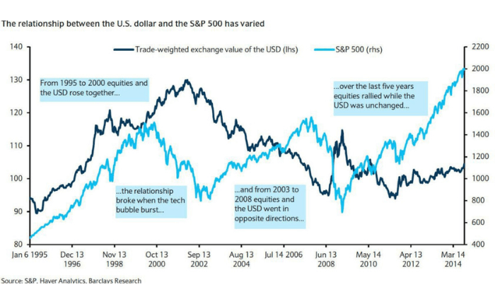 For example, the historical relationship between the U.S. dollar and the S&P 500 hasn’t been consistent.