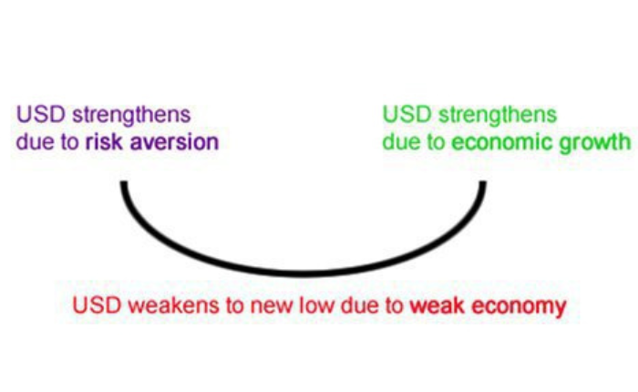 The first part of the smile shows the U.S. dollar benefiting from risk aversion, which causes investors to flee to “safe haven” currencies like the U.S. dollar and the Japanese yen.